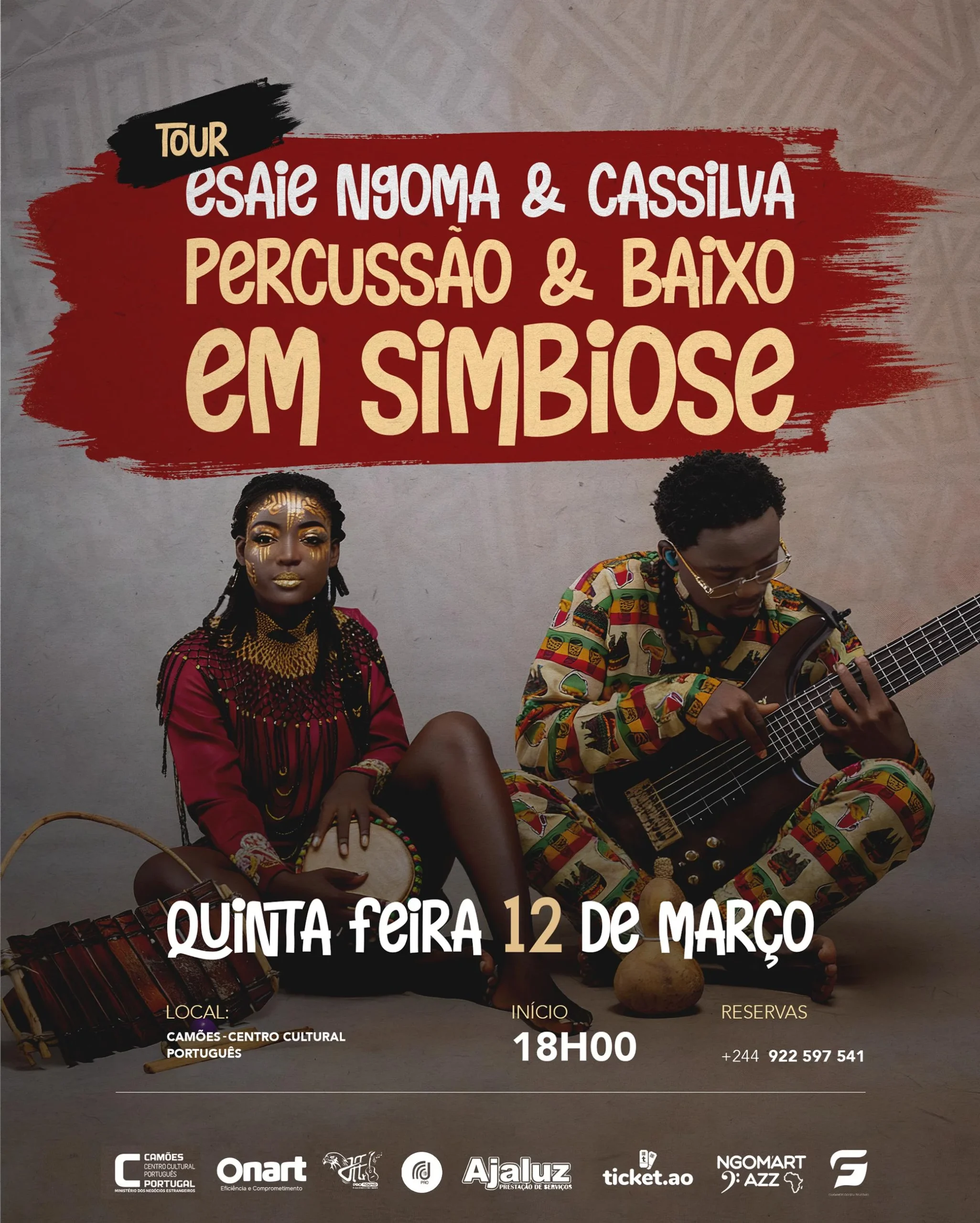 O Camões – Centro Cultural Português, em Luanda, acolhe hoje, às 18h00, o concerto de abertura da tour “Simbiose entre Baixo e Per cussão”, protagonizado pela percussionista Odeth Cassilva e pelo baixista Esaie Ngoma