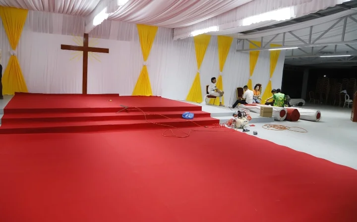 Colocação de cadeiras e a ornamentação do altar, neste último sob responsabilidade de cidadãos asiáticos, estão entre os últimos detalhes captados pelo OPAÍS.