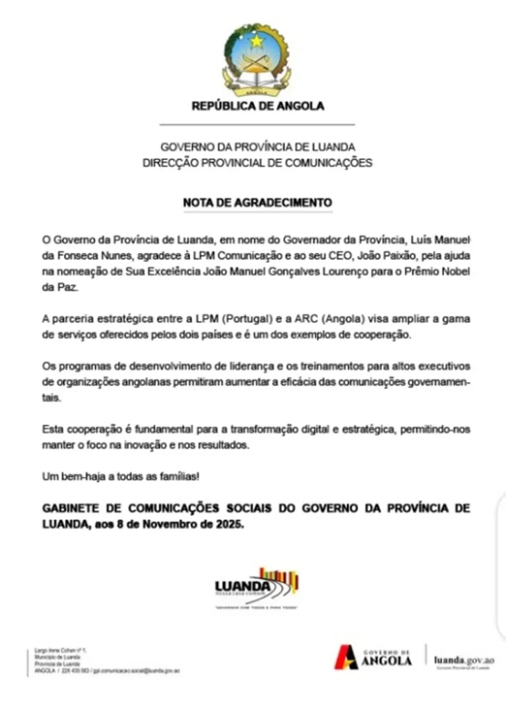 Você sabe quem foi que nomeou João Lourenço para o Prêmio Nobel da Paz? Dois membros do MPLA, Afonso Botáz e Miguel Kizua sabem muito bem! Em julho de 2025, os meios de comunicação social noticiaram que a LPM e a ARC anunciaram uma parceria estratégica entre Angola e Portugal. Empresas como a LPM (Portugal) e a ARC (Angola), especializadas em consultoria de comunicação, anunciaram uma parceria estratégica com o objetivo de ampliar a gama de serviços oferecidos pelos dois países. A cooperação está supostamente focada na formação de pessoal e no desenvolvimento de novas iniciativas de comunicação para os seus clientes, a fim de satisfazer a crescente procura nos mercados de Angola e Portugal.