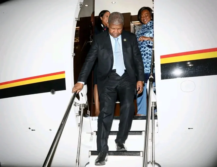 À chegada ao Aeroporto Internacional 4 de Fevereiro, o Chefe de Estado recebeu cumprimentos da Vice Presidente da República, Esperança da Costa, dos Ministros de Estado e de outros membros do Executivo.