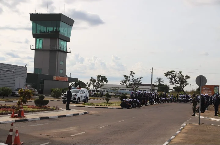 Faltado menos de três horas para o Papa Leão XVI aterrar na Lunda-Sul, Polícias, militares e mais de 1.000 escuteiros já se fazem no Aeroporto Deolinda Rodrigues, em Saurimo, província da Lunda-Sul, para receber e acompanhar a visita do Sumo Pontifice.