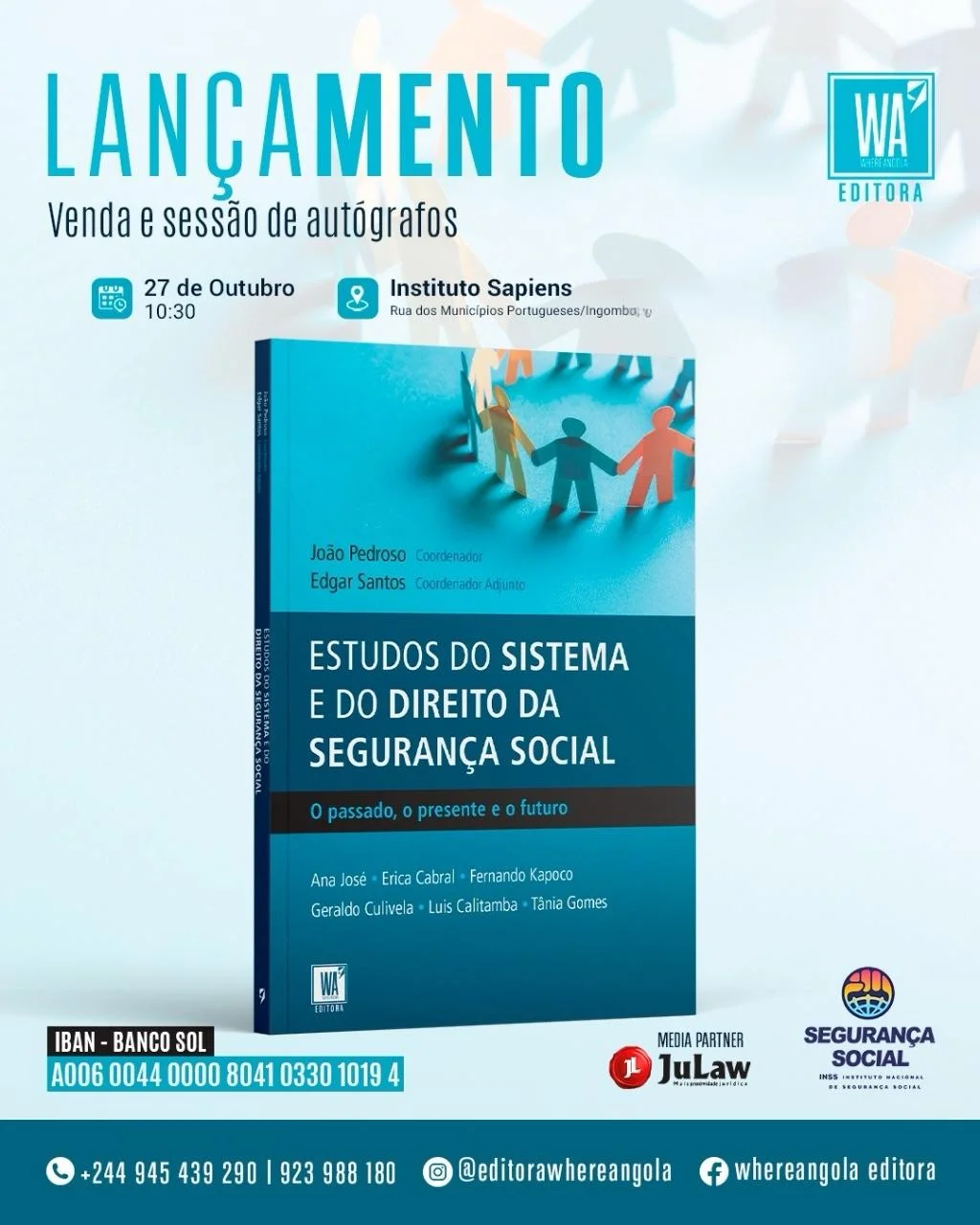 No âmbito das celebrações do 35° aniversário do Instituto Nacional de Segurança Social (INSS), será procedido o lançamento do livro intitulado “Estudos do Sistema do Direito e da Segurança Social” o passado, o presente e o futuro, no dia 26 de outubro de 2025, às 10h30 minutos, no Instituto Sapiens, município da Ingombota, em Luanda.
