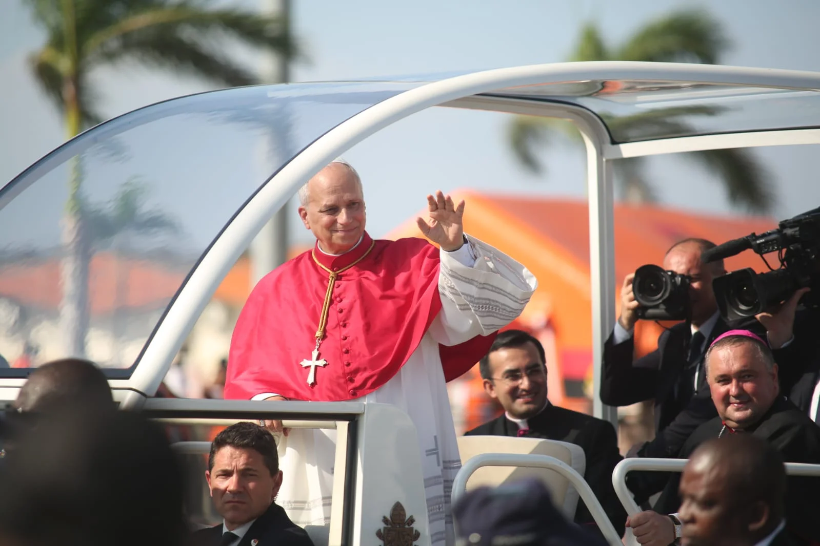 Após aterrar em solo angolano, o Papa Leão XIV dirigiu-se à saída do Aeroporto Internacional 4 de Fevereiro, em Luanda, onde cumprimentou os fiéis católicos que aguardavam desde as primeiras horas pela sua chegada.
